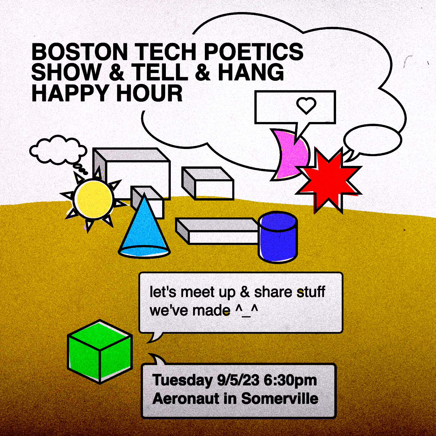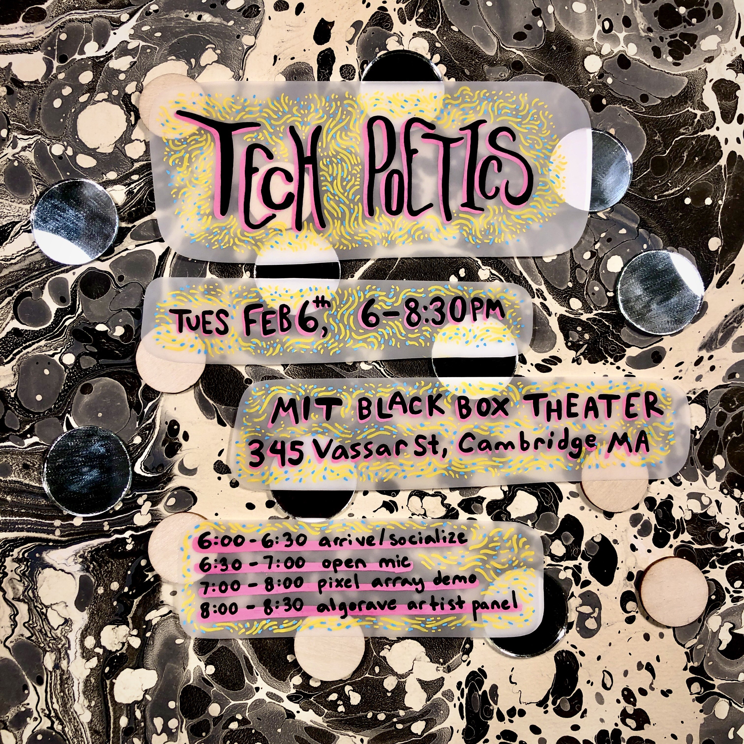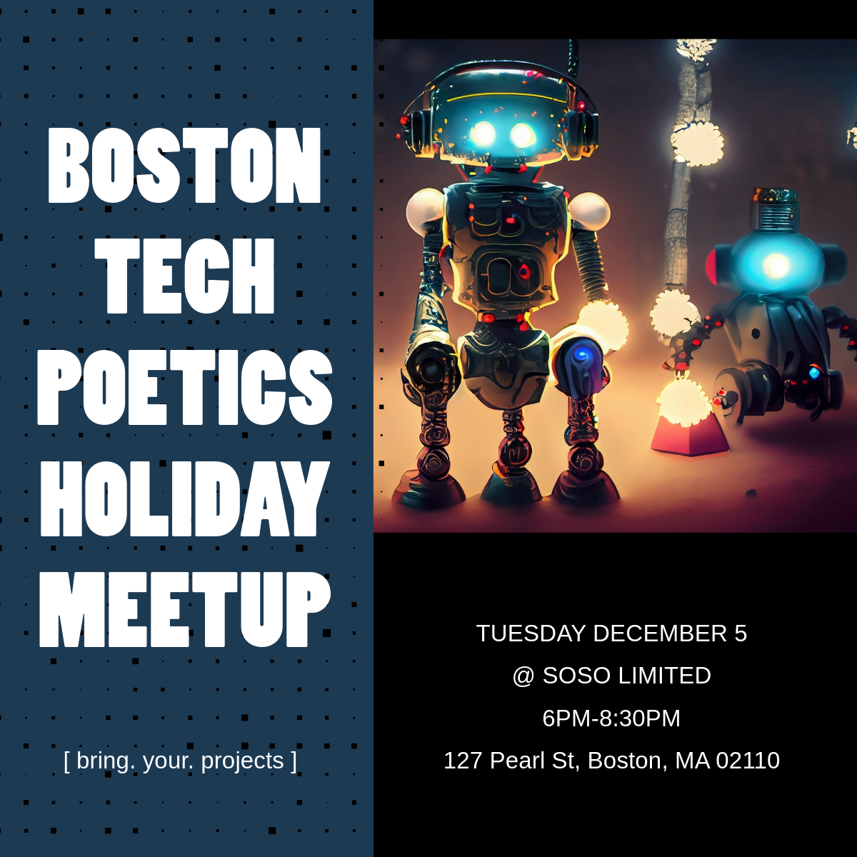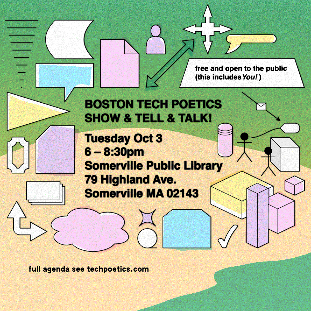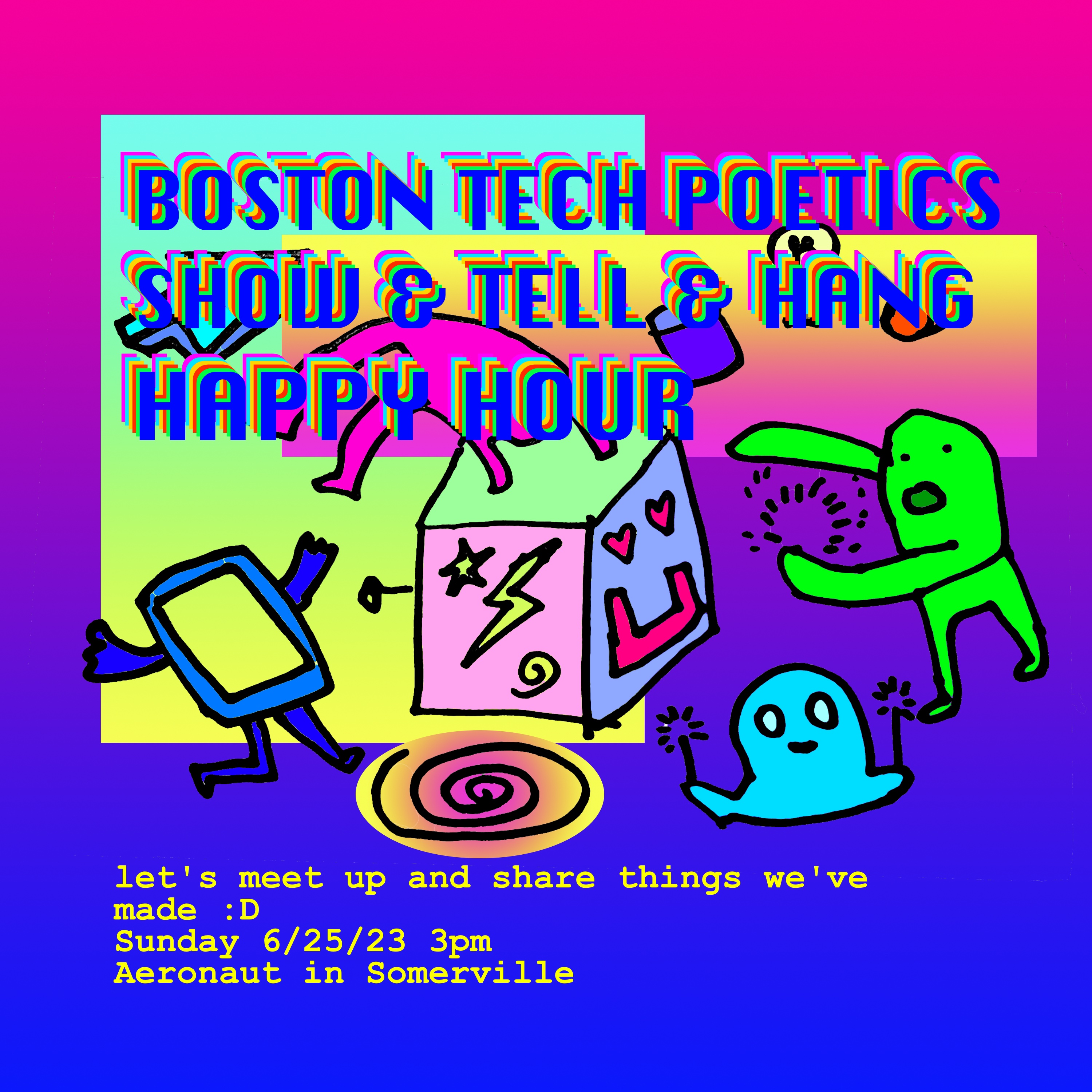 Everyone is encouraged to share their latest projects with the Boston Tech Poetics scene.
