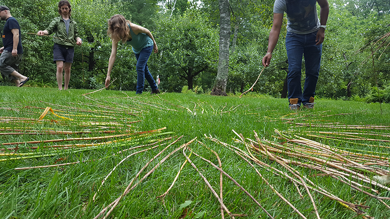 In August, Boston Tech Poetics invited 16 artists and creators to Ringe, NH to unplug and explore some of the topics covered in prior tech poetics meetings in a natural surrounding. Three workshops were held focused on the topic of 'Digital to Analog'. Kawandeep Virdee led a workshop on pattern drawing in nature. Adam Ribaudo led a workshop on digital music production with analog instruments. Rosa Weinberg and Sadiya Akasha led a workshop on programming with human looms.